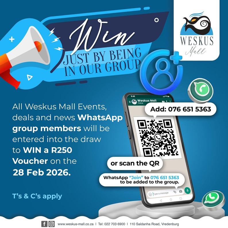 All Weskus Mall Events, deals and news WhatsApp group members will be entered into the draw to WIN a R250 Voucher on the 28 Feb 2026. T's & C's apply