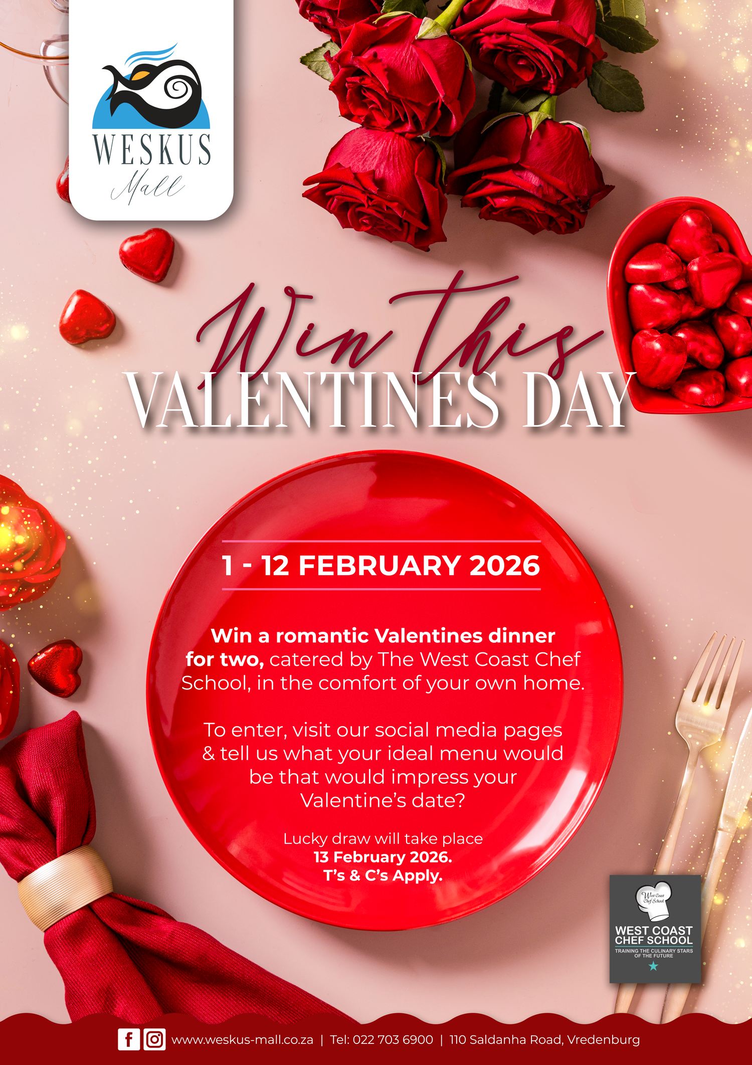 Win a romantic Valentines dinner for two, catered by The West Coast Chef School, in the comfort of your own home.To enter, visit our social media pages & tell us what your ideal menu would be that would impress your Valentine's date?Lucky draw will take place 13 February 2026. T's & C's Apply.