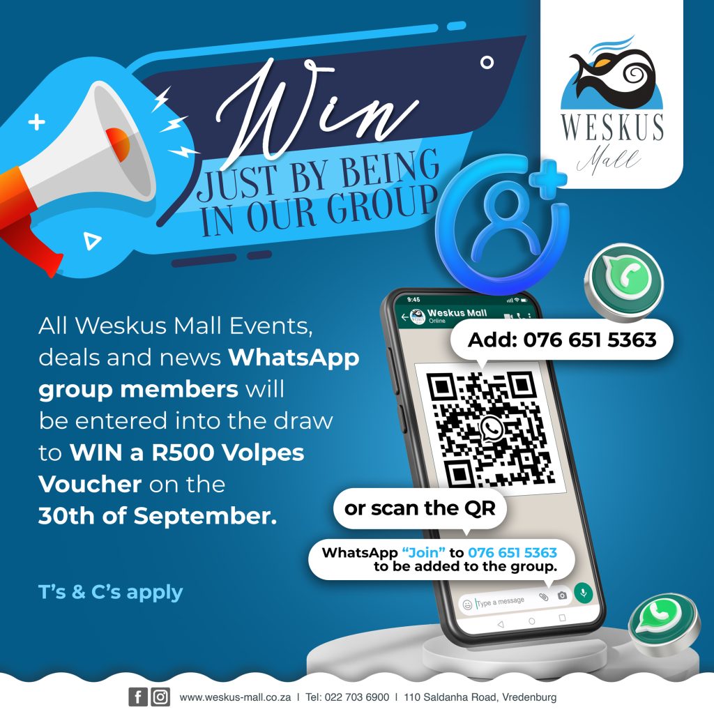 All Weskus Mall Events, deals and news WhatsApp group members will be entered into the draw to WIN a R500 Volpes Voucher on the 30th of September. T's & C's …