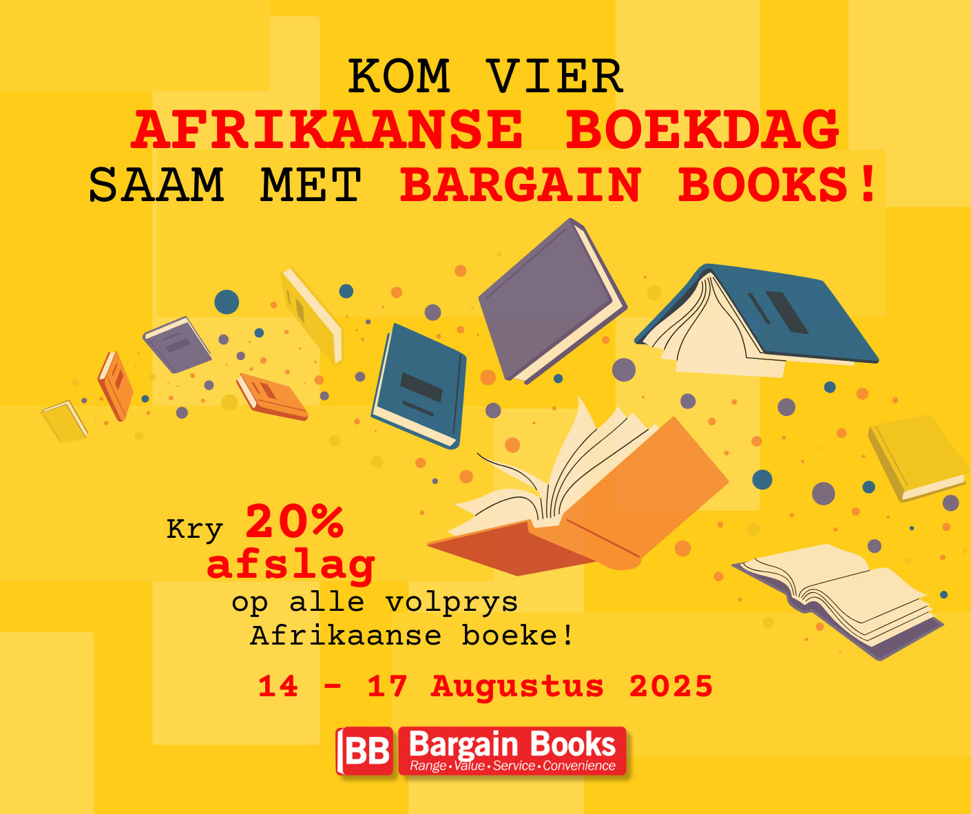Van 14 tot 17 Augustus 2025 bied Bargain Books SA -takke 20% afslag op Afrikaanse boeke deur jou gunstelingskrywers: Dana Snyman, Marita van der Vyver, Chanette Paul, Deon Meyer, Madeline Rust en baie ander.